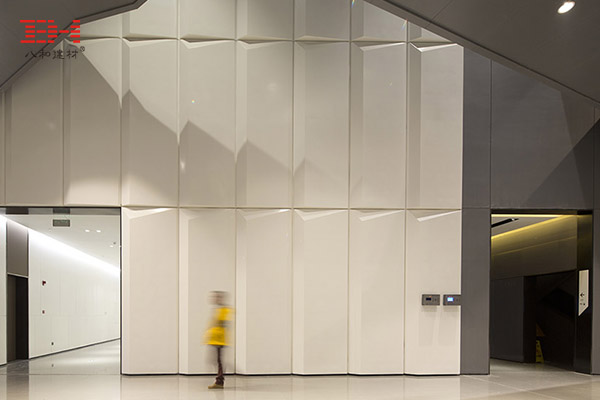 內部裝飾方面,設計師則定制了大尺寸的造型鋁單板,以大尺寸的鋁單板作為裝飾使得建筑內部更加簡約大氣。