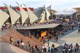 同樣是厚重的木結(jié)構(gòu),法國館卻另辟蹊徑。大波浪的曲線造型,以及木材與木材間恰到好處的間隙,使得整個場地也變得飛揚(yáng)起來。與英國館相類似,法國館的前景也被拉得很長——曲曲折折的小路由各種常見的法國田園蔬果所圍繞,一直延伸至展館的入口。法國館的內(nèi)部,絲毫不夸張地形容即是——“360度無死角”。無論是俯瞰、仰視亦或是平視,視線內(nèi)都總是充斥著滿滿的內(nèi)容。每一個與建筑結(jié)構(gòu)相關(guān)的交差網(wǎng)格,都被當(dāng)成是展示鍋碗瓢盆和瓜果蔬菜生鮮飲品的“展示柜”。心里不禁琢磨著:這個場館大概可以被當(dāng)做是,建筑和展覽契合度最高的一個案例吧。重要的是,該建筑的結(jié)構(gòu)由3D技術(shù)完成,并可以在世博會以后方便回收。因此,盡管意大利當(dāng)?shù)厝硕啻伪硎?,米蘭政府并沒有想好要怎么處理這些世博館,但是無疑法國人已經(jīng)給自己想好了退路,并抱著目標(biāo)一如既往地可持續(xù)發(fā)展下去。